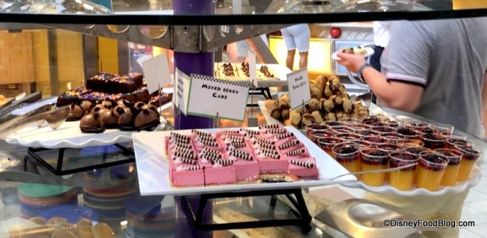 On the buffet, selections were pretty standard, and for dinner they included — but were not limited to — soups and salads, a meat-carving station, pasta dishes (like Mickey-shaped Cheese Ravioli), plenty o’ sides like scalloped potatoes, Chef Mickey’s Mac and Cheese, and more for the little ones.