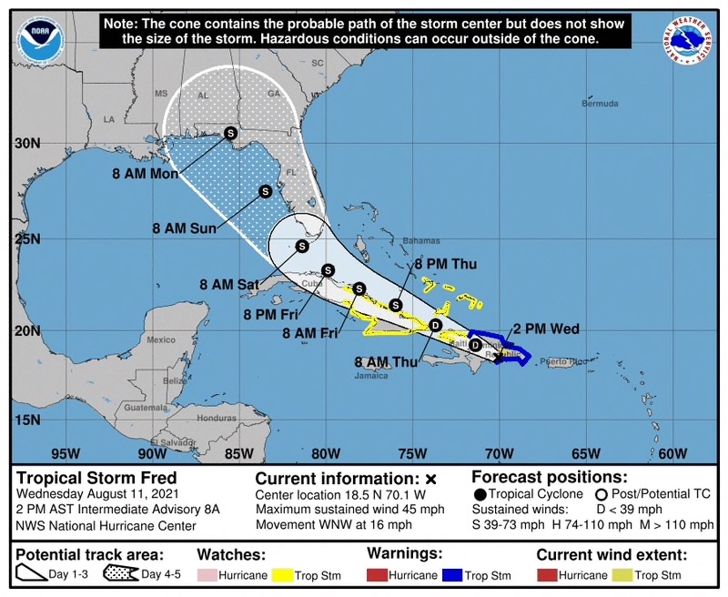 Here are the 5 AM AST Aug 11 Key Messages for Tropical Storm #Fred, which is currently approaching the Dominican Republic. More information: https://t.co/vbprzkjSVW pic.twitter.com/wtsCfTo0TR