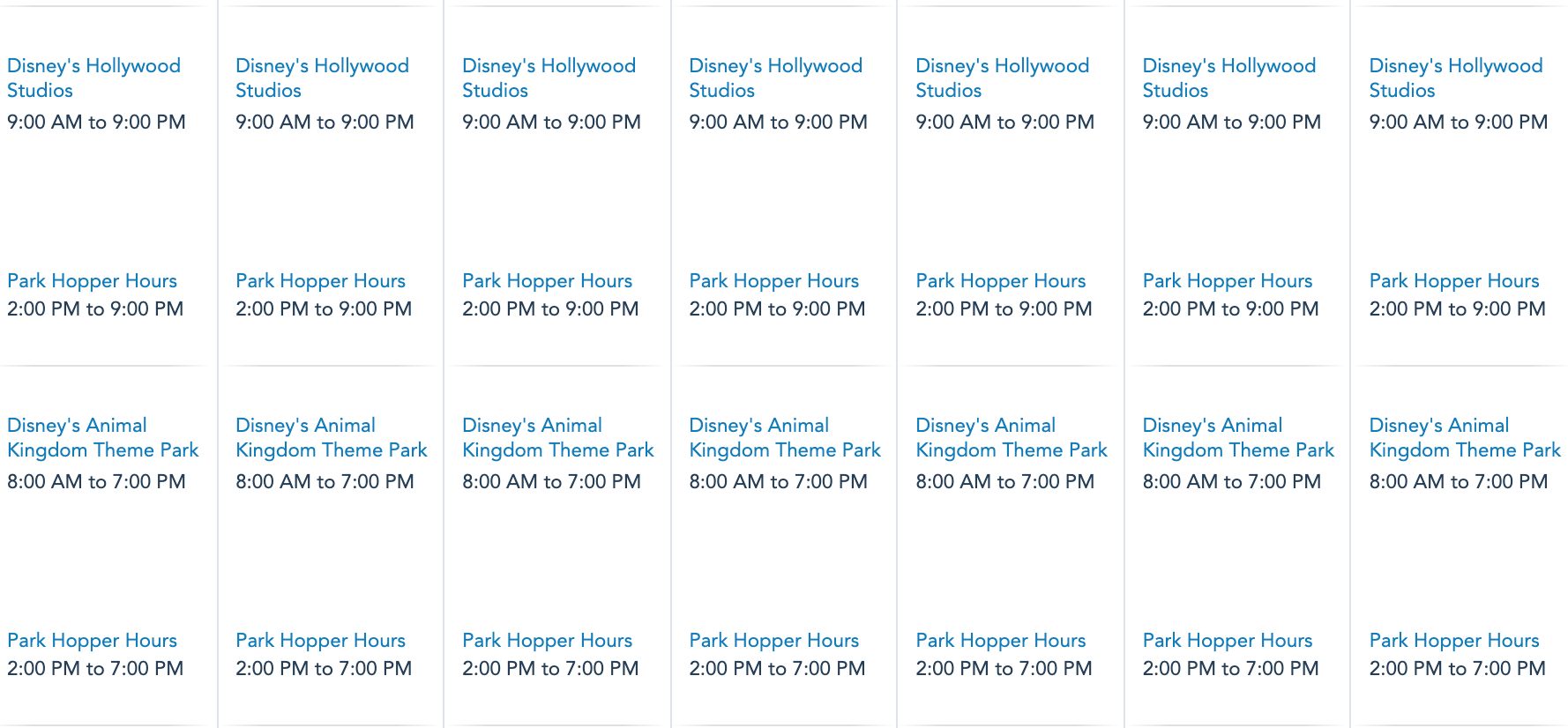 The schedule is pretty simple for Hollywood Studios, which is open from 9AM-9PM daily. The same goes for Animal Kingdom, with hours from 8AM-7PM.