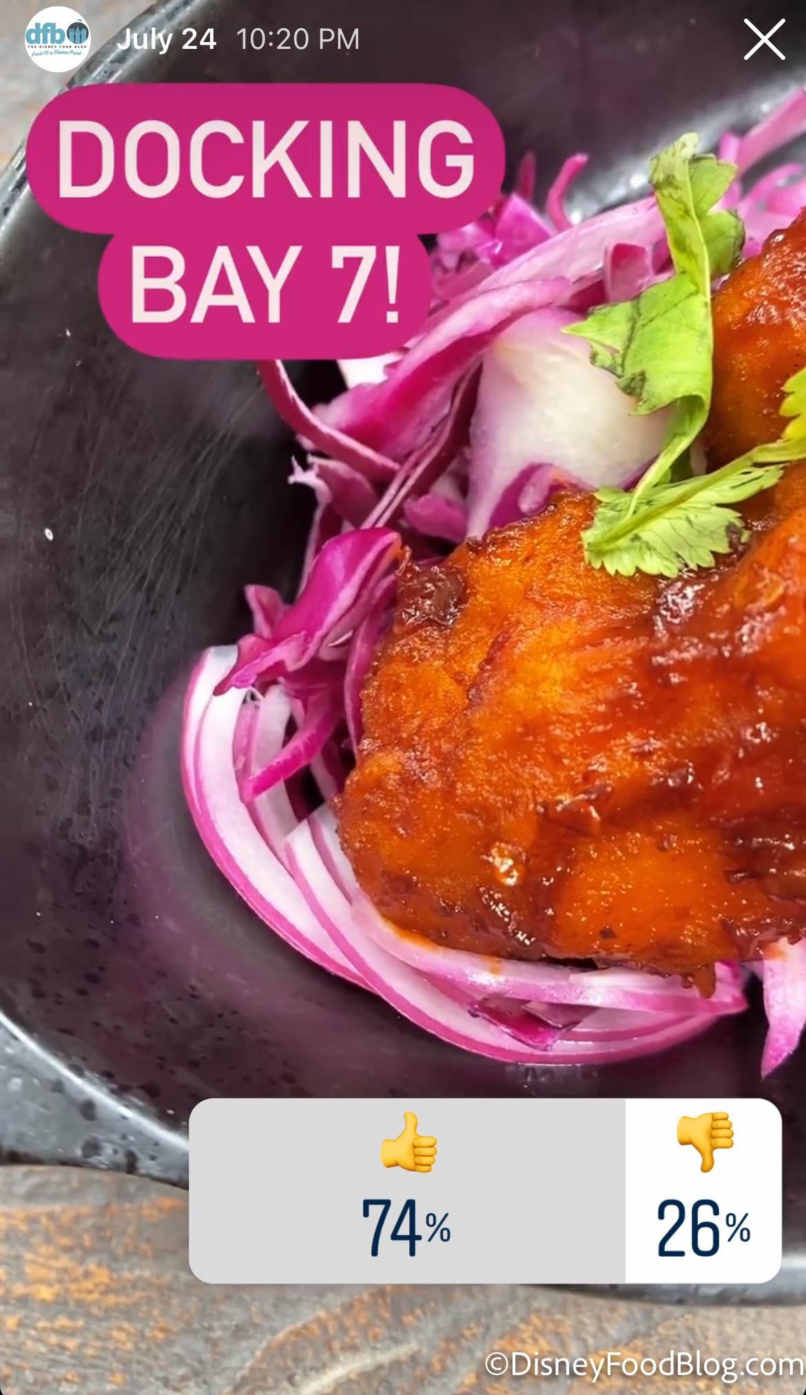 Docking Bay 7 was voted just a bit ahead of Backlot Express at 74%. With foods inspired by the “local” dishes of the planet Batuu in Star Wars: Galaxy’s Edge, the menu is “out of this world” and fun!
