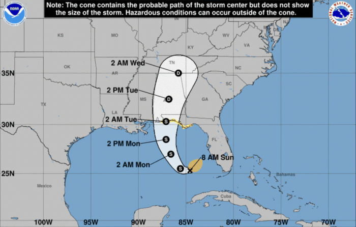The National Hurricane Center’s advisory says, “On the forecast track, the system will cross the southeastern Gulf of Mexico today, cross the east-central and northern Gulf of Mexico tonight and Monday, and move inland along the northern Gulf coast Monday night or early Tuesday morning.” Central Florida is not currently in the direct path of the storm, but the outer bands could bring rainy, breezy conditions to the area.