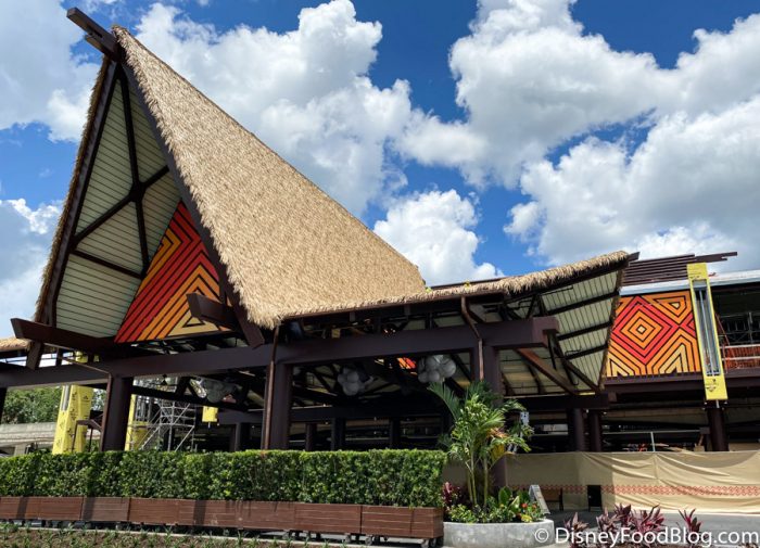 Over at Disney’s Polynesian Village Resort, we also spotted some progress on the new entrance area and monorail station! Now the roof is covered in thatch and brand new colorful panels have been installed to match the entrance.