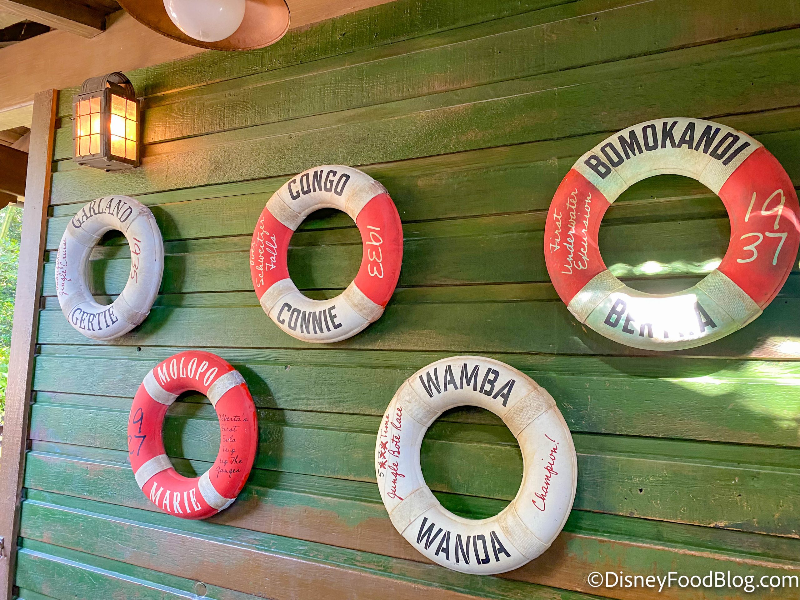 First up, we noticed that there are five new life rings hanging from the wall in the queue and if you’ve been on Jungle Cruise before, you might recognize a few of the names. For example, Garland Gertie commemorates the inaugural Jingle Cruise (which is the holiday overlay for the attraction) and Bomokandi Bertha pays tribute to the “first underwater excursion” that unexpectedly happened last year.