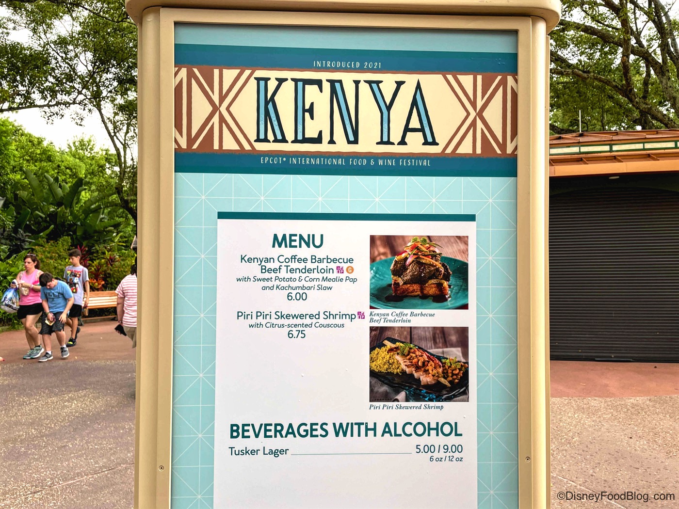 Although Disney lists this as a new booth, the menu items are not new. The booth is serving up 2 dishes we’ve seen at the Food & Wine Festival (at booths that went by a different name) in the past — the Kenyan Coffee Barbecue Beef Tenderloin and the Piri Piri Skewered Shrimp.