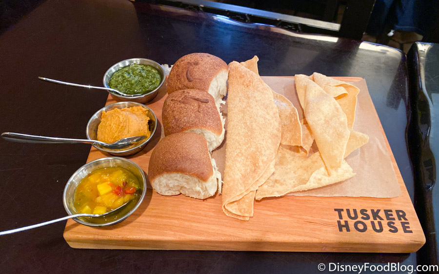 We’re in the top five restaurants now and, for this one, we’re headed over to Tiffins at Disney’s Animal Kingdom! Here you’ll find a signature dining experience and the food isn’t the only standout — there are also tons of unique decorations to explore (much of which focuses on the Imagineers and their inspiration for the creation of the park itself). And, while we enjoy quite a few dishes on the menu, we’re here to talk about bread. That leads us to the first paid bread service on the list — Tiffins Signature Bread Service!