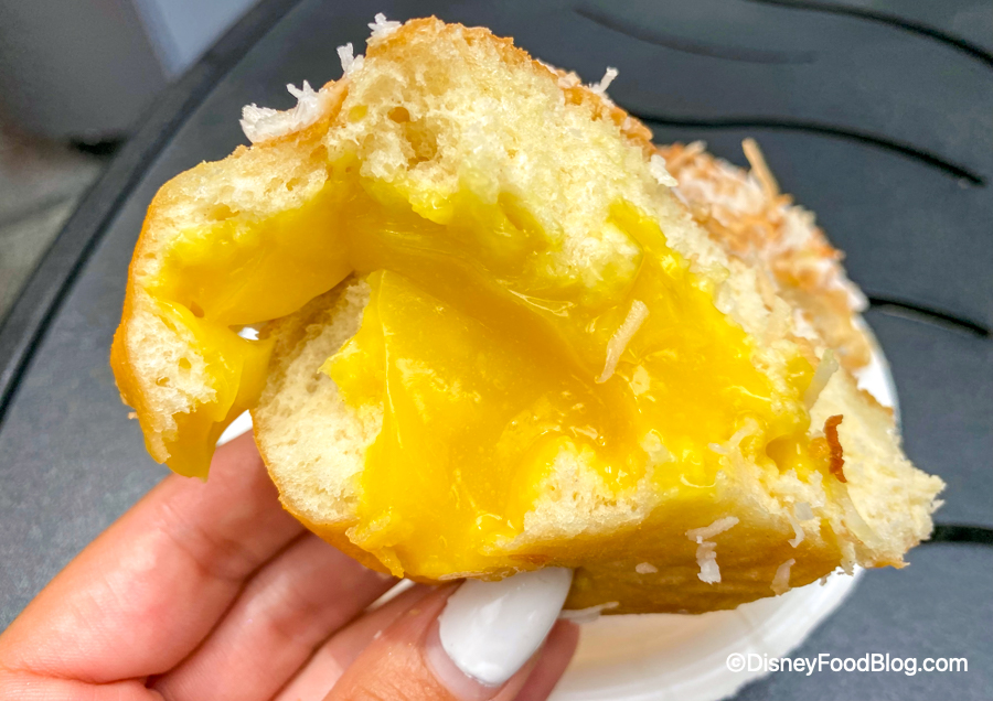 As you can see, it was STUFFED with filling! The passion fruit curd was tart and still sweet. If you like lemon curd this is similar but much more fruit forward and tropical flavored. The coconut is really only present in the coconut shavings. The toasted shavings reminded us a bit of another EPCOT favorite, School bread from the Norway Pavilion! This donut tastes like summer!!
