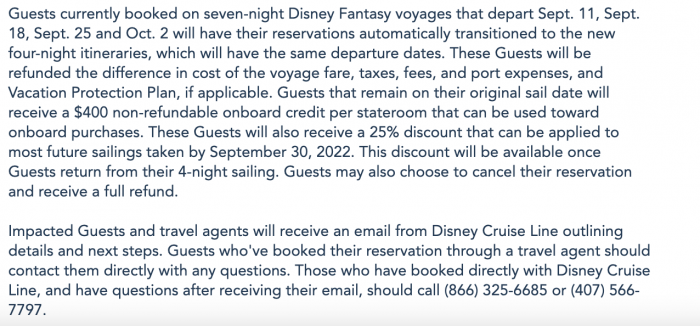 If your voyage was modified, you will be refunded the difference in cost. Disney also noted that “Guests that remain on their original sail date will receive a $400 non-refundable onboard credit per stateroom that can be used toward onboard purchases. These Guests will also receive a 25% discount that can be applied to most future sailings taken by September 30, 2022.”