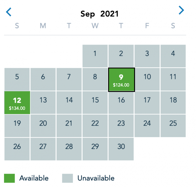 In the month of September, only two dates have tickets available: Thursday, September 9th and Sunday, September 12th.