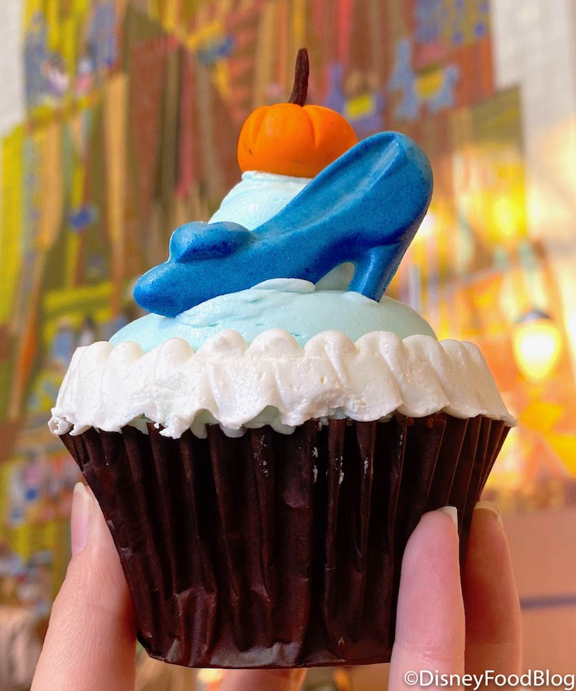 - One of the many Cinderella Cupcakes that were released for her anniversary is back! This one is a vanilla cake with vanilla crème custard filling, buttercream, white chocolate slipper, and fondant pumpkin (available now through September 30)