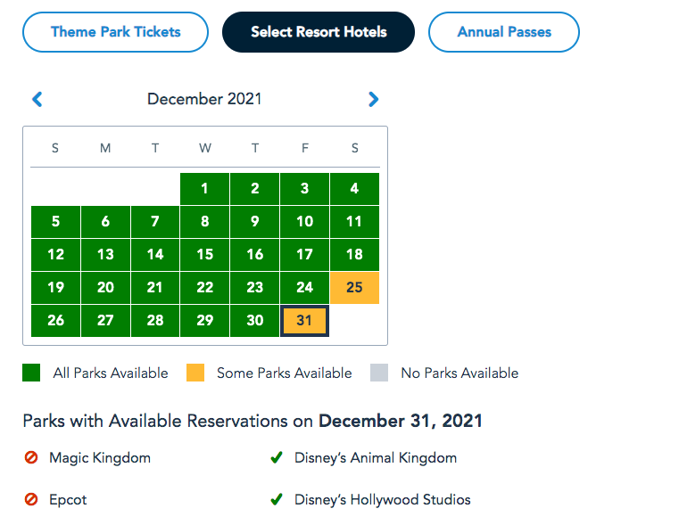 Park Pass Reservation availability for guests staying at Select Resort Hotels on December 31st as of August 17th © Disney