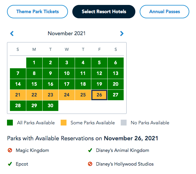 Park Pass Reservation availability for guests staying at Select Resort Hotels the month of November as of August 19th © Disney