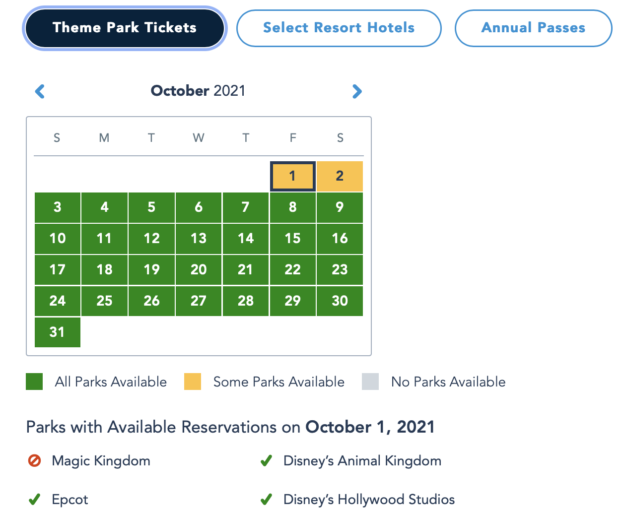 More park passes were added for October 1st!! The parks available now are EPCOT, Hollywood Studios, and Animal Kingdom.