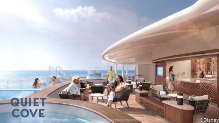 Also nice is the fact that Quiet Cove is ALL the way on the other side of the ship. So, people won’t be walking through Quiet Cove to get to other spaces. Instead, adults can really enjoy the peace and quiet of that area to themselves. Plus, there’s a really great infinity pool with a built-in bench.