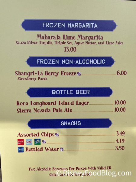 In the past, Warung Outpost had multiple flavors of margaritas that they would layer into different drinks. Right now, however, they only sell a Lime Margarita and a nonalcholic Strawberry frozen beverage called Shangri-La Berry Freeze.