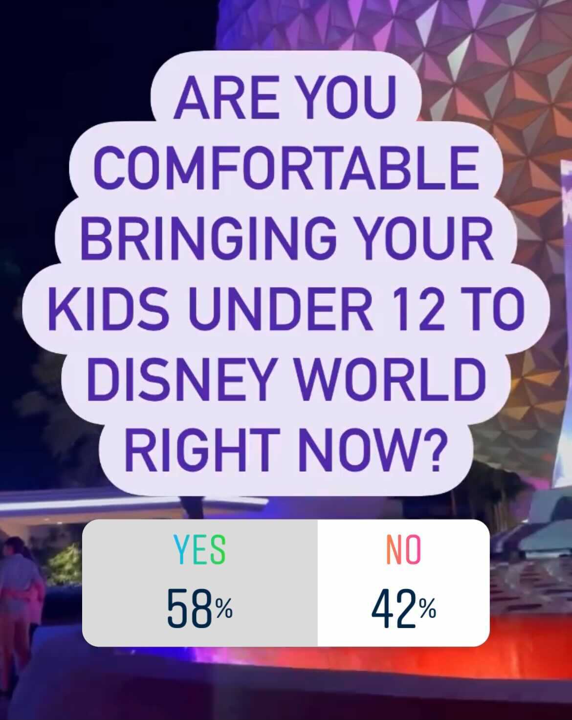 6,107 people voted “yes” and 4,469 people voted “no.” So, there’s a good chunk of people on both sides, but the majority of our readers who answered the poll say they are comfortable bringing their kids under the age of 12 to Disney World.