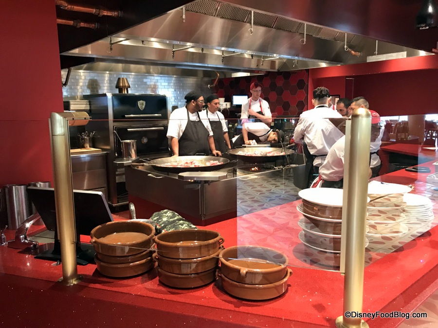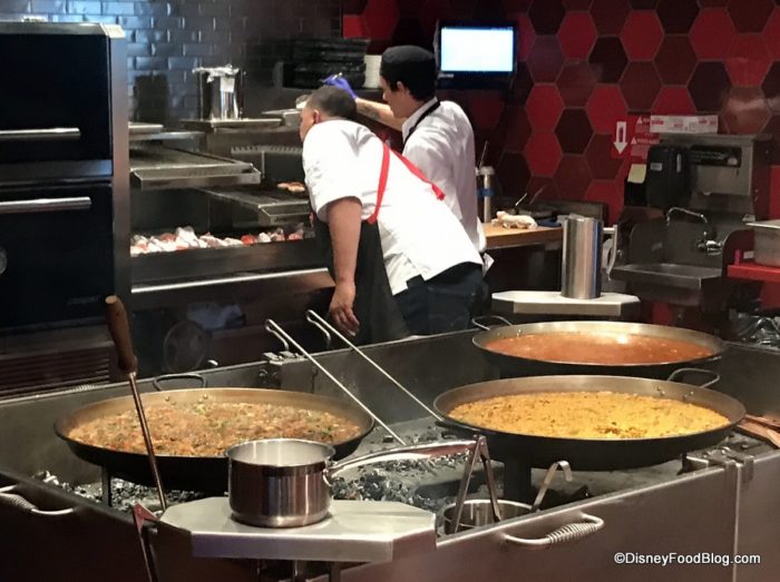The centerpiece of this kitchen is the Paella Pit, which has giant bowls of paella cooking over hot coals. Keep an ear out, you’ll periodically hear the chefs back here having what sounds like WAY too good of a time! 🙂