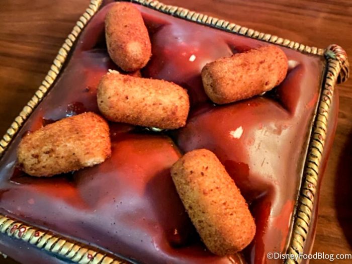 So there’s a story to this next tapas, the signature Croquetas de Pollo or Chicken Croquettes for $12. When chef José Andrés was a little boy, he would put his feet up on the table, and then his mom would get mad at him for it. When he opened his own restaurants, he decided to serve his signature dish in shoes (clean ones, we’re pretty sure) because he wanted shoes on the table! (Take that, mom?) When Jaleo opened its Disney Springs location, José Andrés changed the serving dish here to a royal pillow like the one used in Cinderella to hold the glass slipper, as a special nod to Disney.