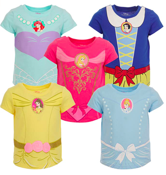 For a group of gals looking for easy Disney princess costumes, we found this set of five princess t-shirts on Amazon! There’s one for Snow White, Ariel, Sleeping Beauty, Belle, and Cinderella!
