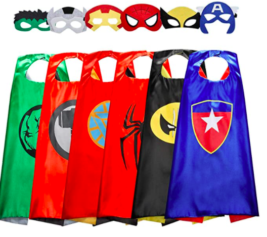 If you’ve got a lot of superhero-loving kids, this next pack is the one for you. It’s a set of six superhero capes with matching masks!