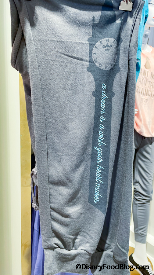 These Cinderella Lounge Pants for $39.99 have a clock striking midnight with more lyric quotes, “A dream is a wish your heart makes”.