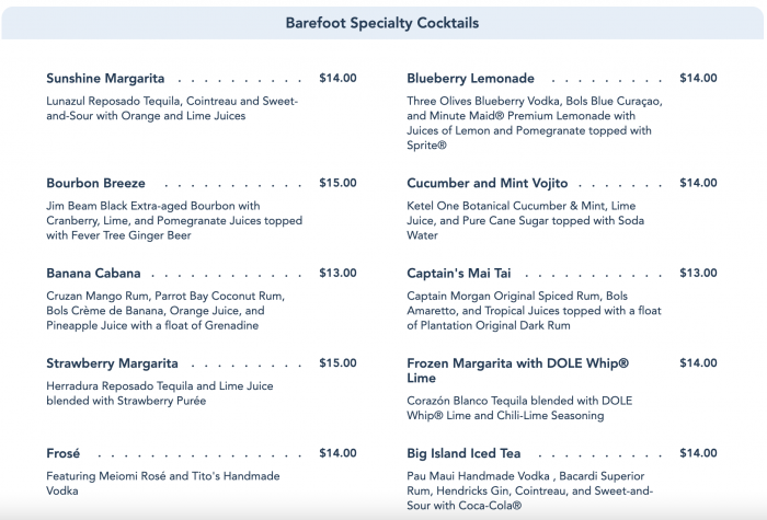 You can’t have a pool bar without a good-sized drink menu, and the Barefoot Pool Bar does not disappoint! There are lots of specialty cocktails to choose from…