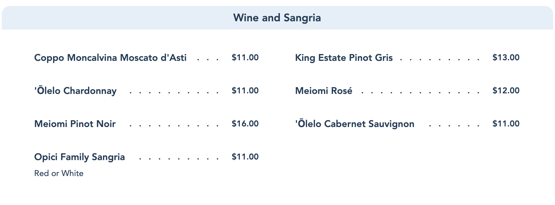 For those of you that prefer wine, there are several options ranging from an $11 Moscato to a $16 Pinot Noir!