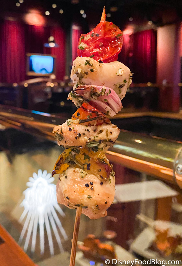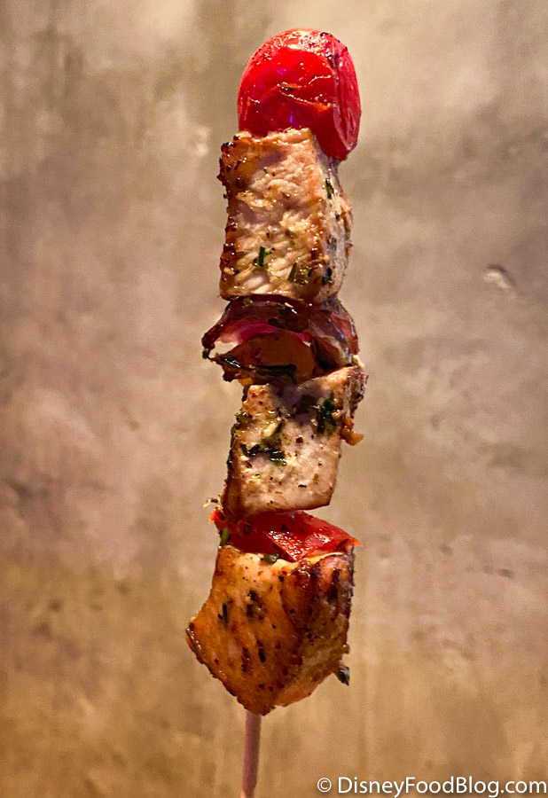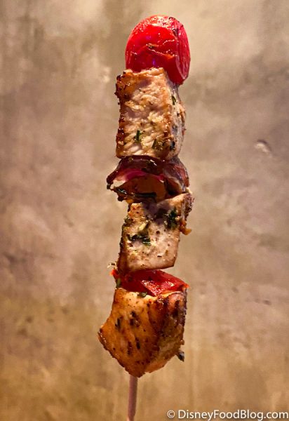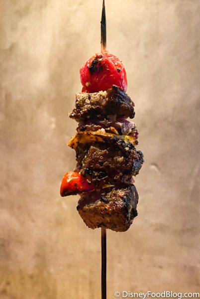 The first skewer consisted of chicken, peppers, onions, and tomatoes. The chicken was seasoned perfectly in our opinion and we loved this mix of flavors.