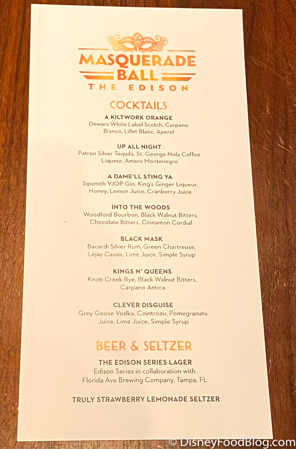Disclosure: In nearly all circumstances, Disney Food Blog writers and photographers pay full price for their own travel, hotel, food, beverage, and event tickets. We do this because it’s important to us as journalists to ensure not only that we give you unbiased opinions, but also that you can trust us to do so since we’re paying our own way. On rare occasions, when we are invited by a company to attend a preview as media, and when we choose to accept that invitation, we will always make you, our readers, aware of that situation. Today, we were invited by The Edison to attend their media event for the Masquerade Ball. Note that when we attend events as media we are 1) Not required to review that event/food on any of our channels, and 2) Not required to review that event/food favorably. You can always count on DFB to give you a 100% unbiased and honest review of any event that we attend, food that we eat, or beverage that we drink. You can see more in our Disclosure Policy. Thank you for reading. — AJ