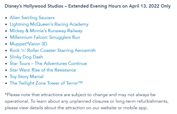 EDITOR’S UPDATE, 2/18/22: Disney’s Hollywood Studios will host its first (and potentially only, according to the Walt Disney World website) Extended Evening Hours on April 13, 2022. Here’s a full list of the attractions set to be open in Hollywood Studios during these extended evening hours.