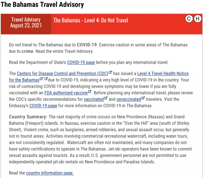 The U.S. State Department and the CDC are advising that people DO NOT travel to the Bahamas due to COVID-19.