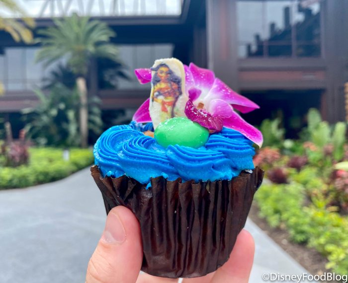 And, we’re heading to Disney’s Polynesian Village Resort to try our next treat! Meet the Moana Cupcake, which is made with a Vanilla Cupcake, Toasted Coconut Mousse, Pineapple Filling, and Vanilla Buttercream with a White Chocolate Moana Accent Piece! This is the Moana cupcake that’s been at the Poly for a while. But this time we noticed an addition of pineapple filling.