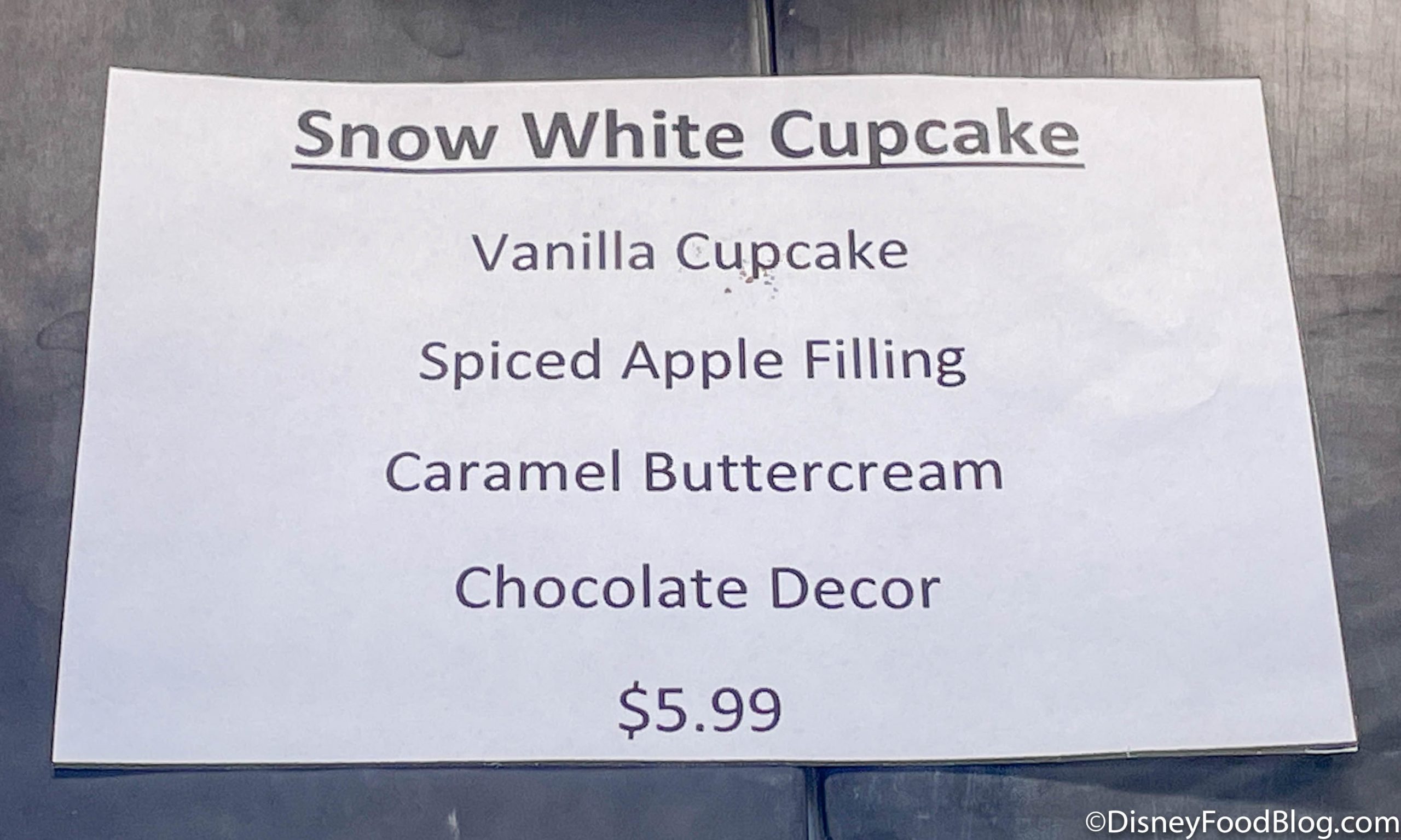 Earlier today, we got the chance to try the Snow White Cupcake, which is a Vanilla cupcake with Spiced Caramel Apple Filling, topped with Caramel Buttercream, Red Chocolate Fondant, and a Red Bow made of White and Milk Chocolate.