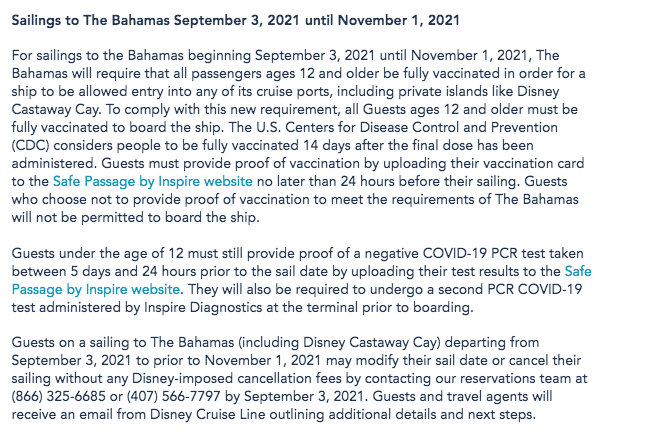 Today, Disney Cruise Line announced a change in its COVID-19 vaccination policy in response to the order from the Bahamas.