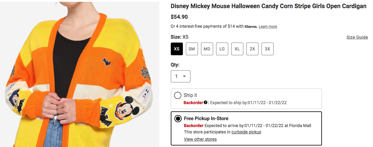 BUT, BE WARNED! You might not be able to snag this cardigan for the 2021 fall season. When we tried to grab one of these cardigans, it showed us that the item was on MASSIVE backorder and isn’t expected to ship until January of 2022!! When we checked a store in Orlando, it also showed that it wasn’t expected to arrive until January of 2022.