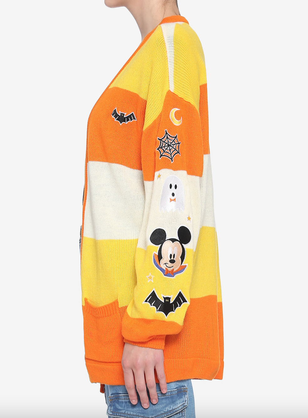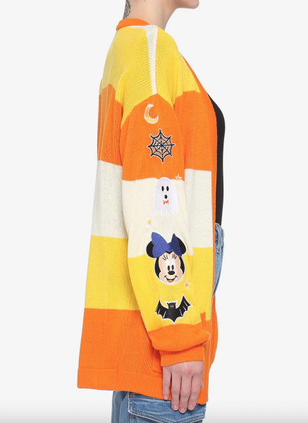 The cardigan features those signature candy corn colors. And the sleeves are FULL of details, like a Minnie Mouse patch, an embroidered crescent moon, and a little ghost friend!