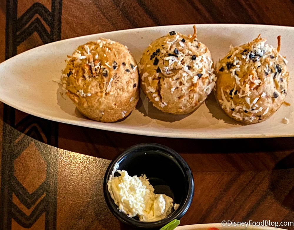 Now we’re getting into the bread service part, and unfortunately, we’ve got some not-so-great news for you ‘Ohana Pineapple Bread lovers: It’s not actually back. (We know, we know!) BUT you can get the OG bread at Kona Cafe, also located at Disney’s Polynesian Village Resort. Let’s all remember how wonderful the old bread was: