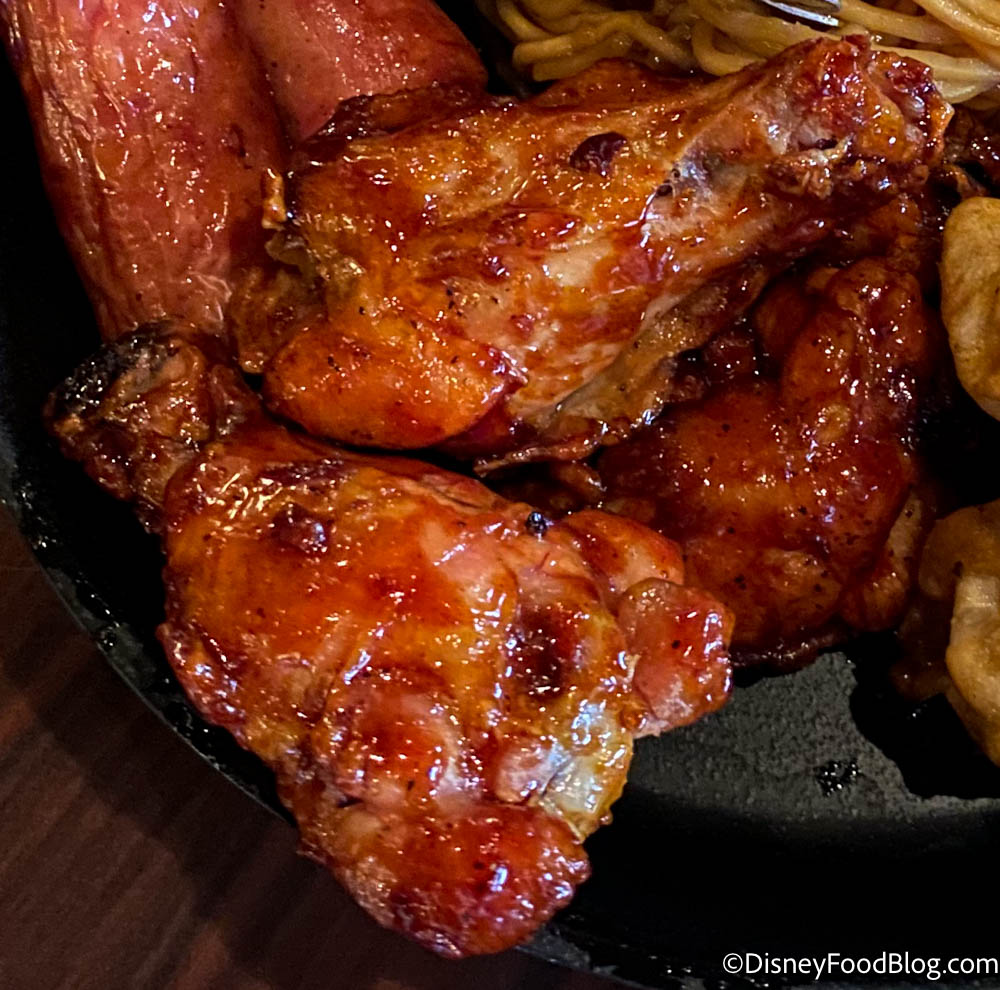 OK, OK, we hear you — let’s move on to why you’re really reading this — the meats (AKA the stuff that’s actually different!). In the ‘Ohana Dinner Skillet, you’ll get Wood-fire Grilled Teriyaki Beef, Spicy Peel-n-Eat Shrimp, and Grilled Chicken with Polynesian-inspired Chimichurri Sauce. The noodles and broccolini are also listed under this skillet, but ours came out with the dumplings and wings.