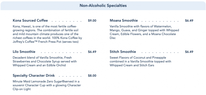 If you’re not drinking during dinner, you can order a non-alcoholic drink from their specialties menu (including a Press Pot of Kona coffee for 2, if you’re in the mood for some hot java)…