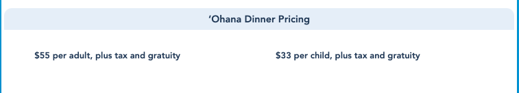 For the dinner, you’ll get all of the items listed under the “All You Care to Enjoy ‘Ohana Dinner” section.