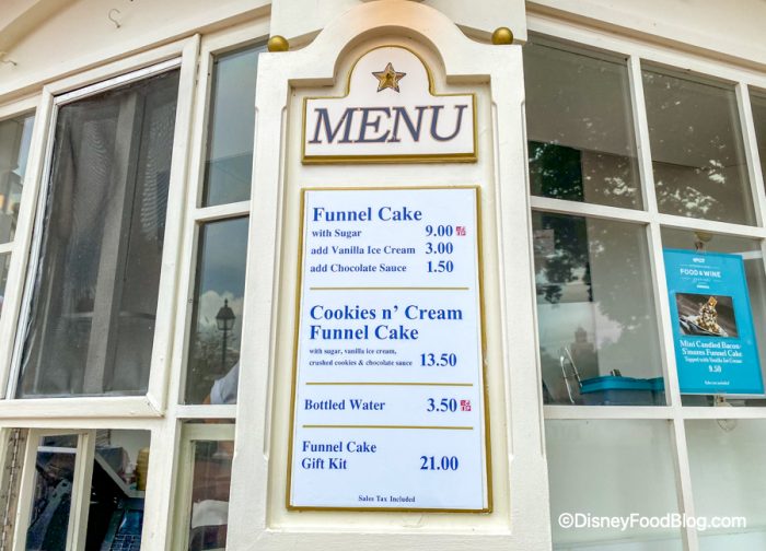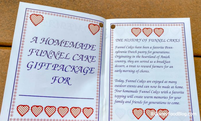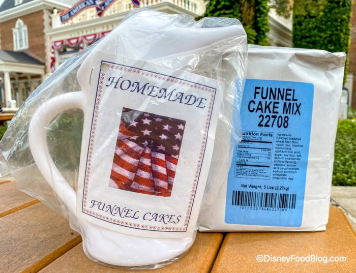 For $21, you can own a Funnel Cake Gift Kit straight from the Funnel Cakes kiosk in EPCOT’s American Adventure pavilion. That’s right. It’s not an actual funnel cake (that you can eat right then and there), it’s a funnel cake KIT that’ll help you make funnel cakes at home!