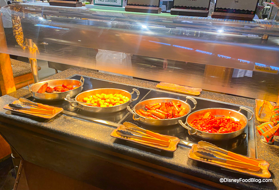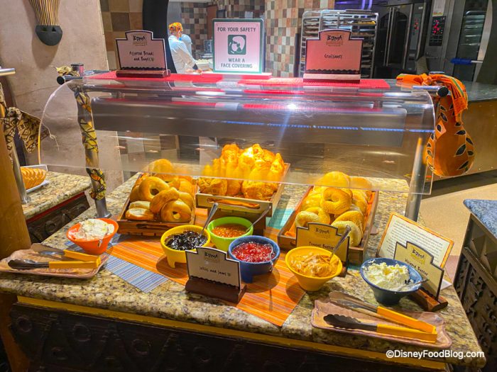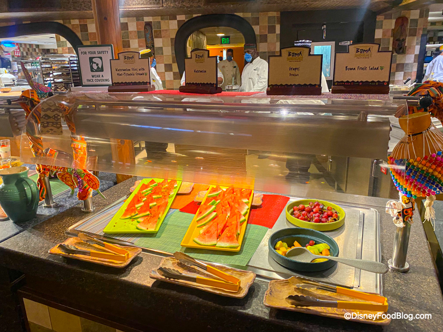 OK, our mask is secured, our hands are clean — let’s check out all of the food! Since Boma is in the first phase of buffets returning to Disney World, we were eager to hit the buffet line and see what they had prepared for us!