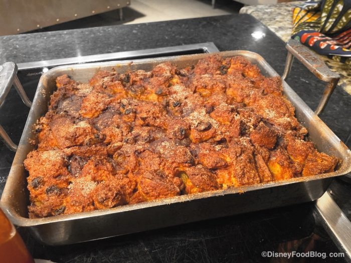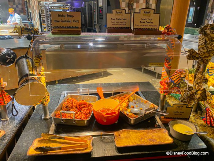 Boma is back and we couldn’t be happier! We really enjoyed our breakfast buffet at Boma; items like the Chakalaka, French Toast Bread Pudding, Sticky Buns, and Scrambled Eggs really stood out as stars of the show. The atmosphere, the service, and the meal were all amazing. This spot is definitely for the sliiiightly more adventurous palates (we highly recommend the ‘Ohana breakfast over at Disney’s Polynesian Village Resort if you’re looking for something less adventurous) but that was part of the appeal! But if you do have some picky eaters in your group, there are still quite a few classic options to choose from. (Those blueberry pancakes were winners for us and you simply can’t go wrong with a Mickey waffle!).