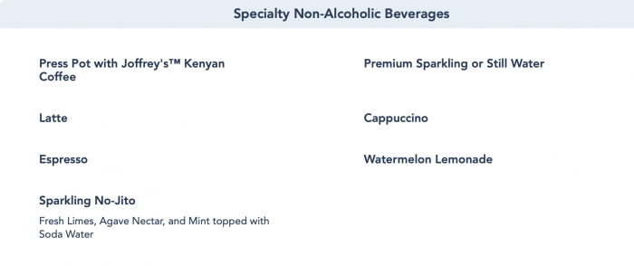 Before we jump into the buffet line, let’s review what’s available. Though the buffet includes juice, milk, fountain drinks, and coffee, there are some Specialty Beverages that you can order for an extra cost.