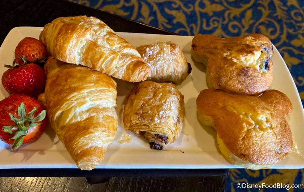 Our breakfast started off with the pastry plate, which included fresh strawberries, croissants (regular and chocolate chip), and Mickey Mouse-shaped blueberry muffins.