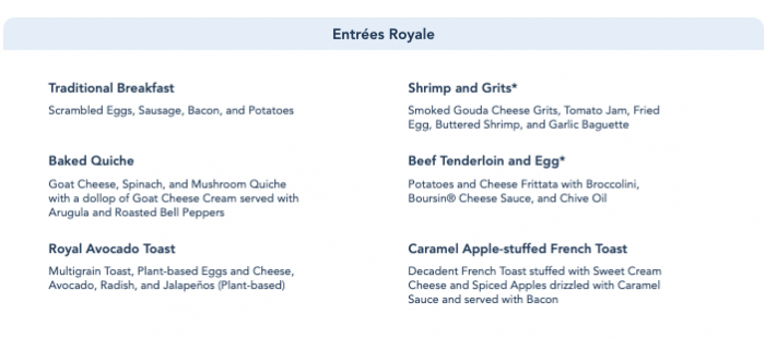 Since it was announced that breakfast was returning to Cinderella’s Royal Table, we had wondered what the menu would look like. We since learned that there were specialty wine cocktails (also served as a flight), an appetizer pastry plate, a few options for entrees, and more breakfast drinks including soft drinks, coffee, hot tea, and juice. Breakfast is $42 per adult and $27 per child, plus tax and gratuity. This includes the pastry plate, an entree, and beverages, but it doesn’t include the specialty wine.