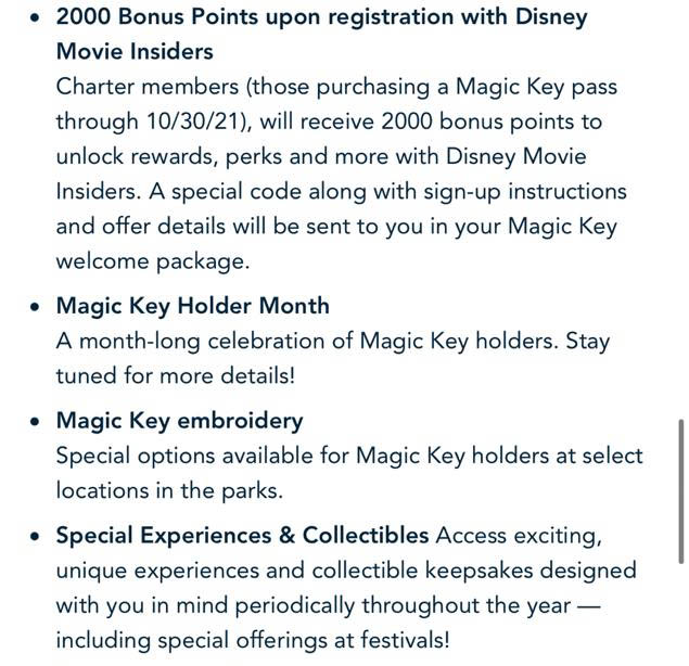 Magic Key holders with Disney Movie Insiders memberships will receive 2000 bonus points. There will be a Magic Key Holder Month celebration soon, and Magic Key embroidery will be available in select Disneyland locations. Magic Key holders will also have special access to experiences, collectibles, discounts, merchandise, and more.
