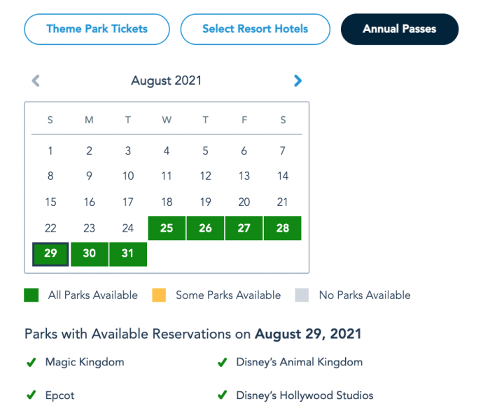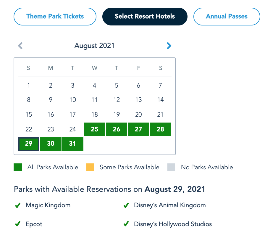 Park Pass Reservation availability for guests staying at Select Resort Hotels on August 29th as of August 25th © Disney
