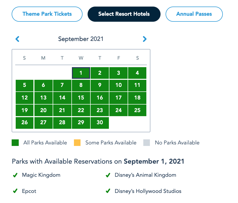 Park Pass Reservation availability for guests staying at Select Resort Hotels on September 1st as of August 25th © Disney