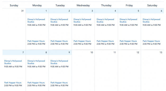 The hours for Disney’s Hollywood Studios for that week are 9AM to 9PM.