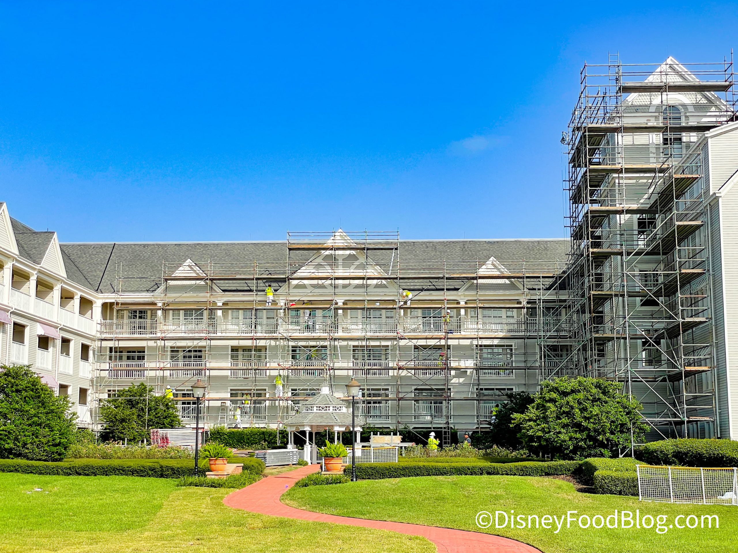 Disney hasn’t shared official details about what kind of work they’re doing here, but when we last spoke with a Cast Member, they believed that it was simply routine maintenance on balconies and the exterior of the hotel.